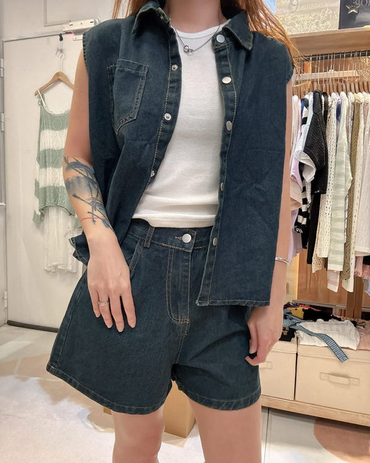 🇰🇷薄牛仔啪鈕背心+牛仔闊短褲