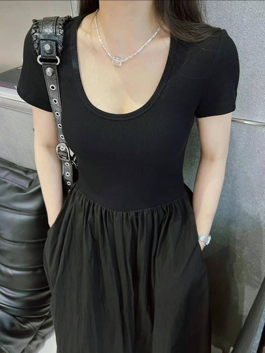 彈性棉質拼雪紡連身裙-短袖