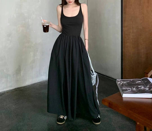 彈性棉質拼雪紡連身裙-吊帶